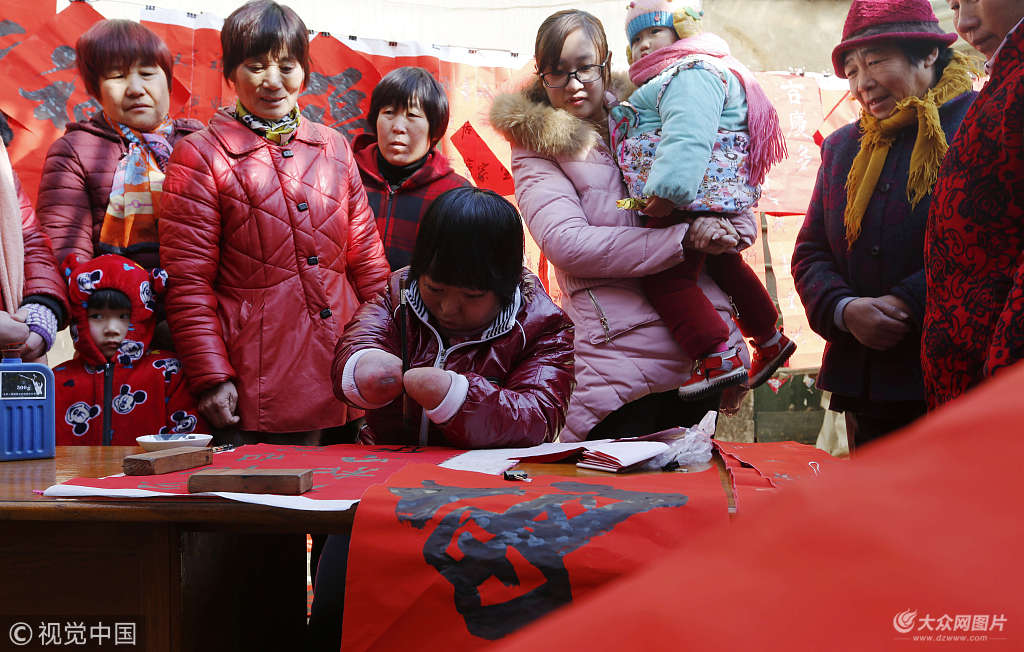 2018年1月26日,山東臨沂,新年臨近,山東臨沂大學(xué)法學(xué)院社會(huì)工作系“無手女大學(xué)生”劉潔,利用寒假返鄉(xiāng)的機(jī)會(huì),義務(wù)為村里的孤寡老人、貧困戶書寫春聯(lián),回報(bào)鄉(xiāng)親。