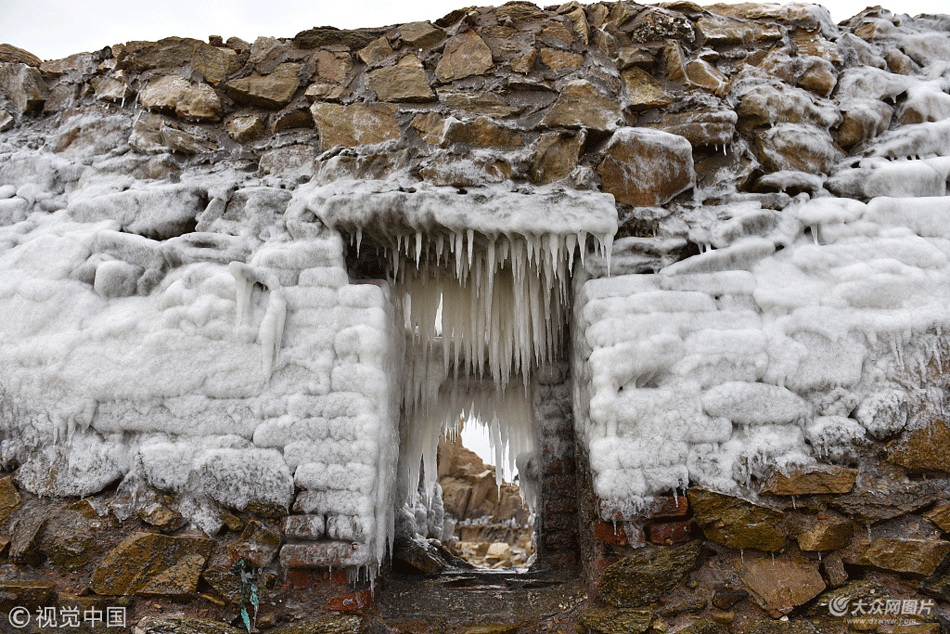 2018年1月27日,山東省日照市山海天旅游度假區(qū)任家臺村礁石公園,海邊的天然礁石上布滿了一層白色的海冰。連續(xù)多日的低溫,致使海水結冰,附在礁石上,晶瑩剔透,遠遠看去,猶如一片片“玉石”。