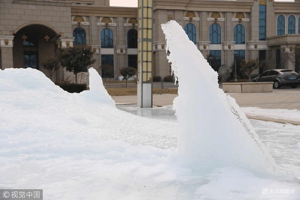 2018年1月27日,山東濱州,持續(xù)低溫天氣令氣溫驟降,當(dāng)?shù)匾患掖缶频觊T前的大型噴泉被凍成了“冰山”,引來(lái)許多市民前來(lái)圍觀。