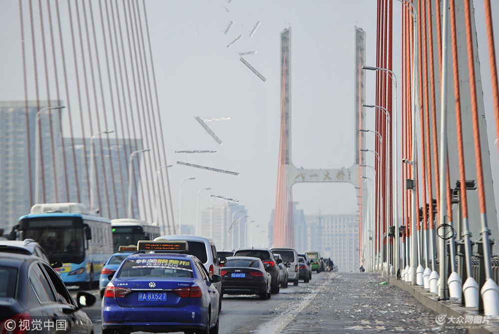 2018年1月29日,江西南昌城里出現(xiàn)了冰凍天氣。1月29日,天氣轉(zhuǎn)晴,南昌八一大橋斜拉索上的冰塊開始大面積融化,變成“冰彈”,不定時地砸向過往車輛,短短幾個小時時間,30余輛小車被砸中。