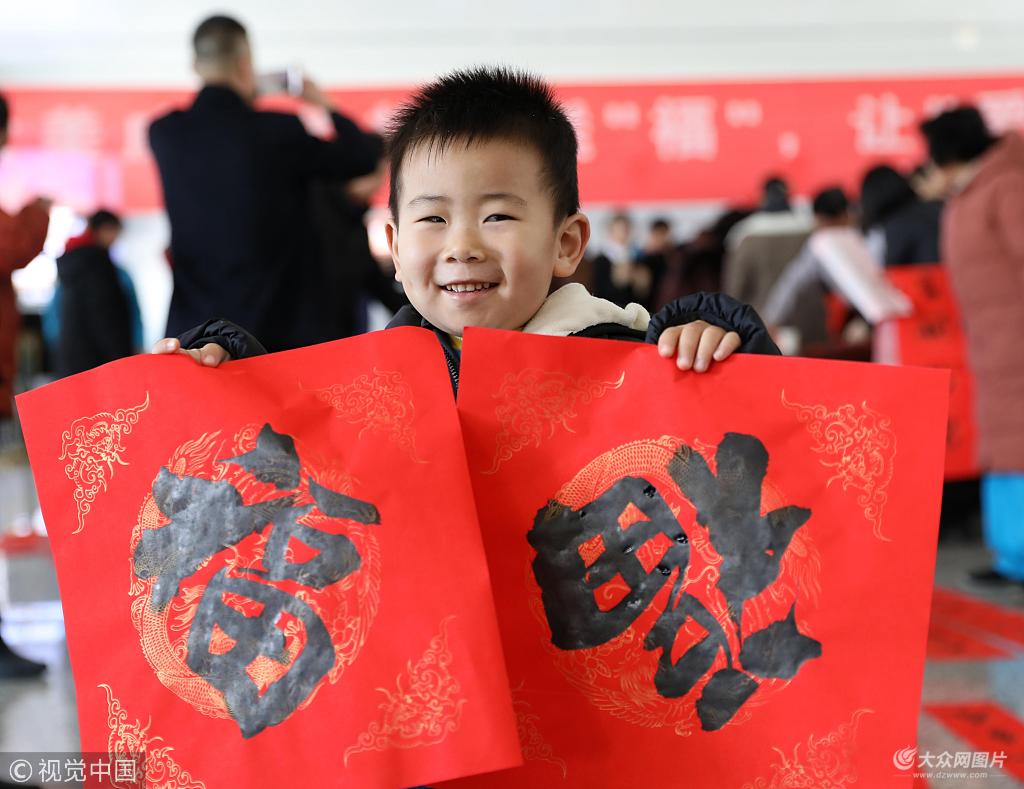 2018年2月1日,在山東省威;疖囌竞蜍嚧髲d,小萌娃高興地展示剛拿到的福字。當(dāng)日,威海市書法家志愿者走進(jìn)威;疖囌,為旅客書寫春聯(lián)、福字,讓愛溫暖旅途。