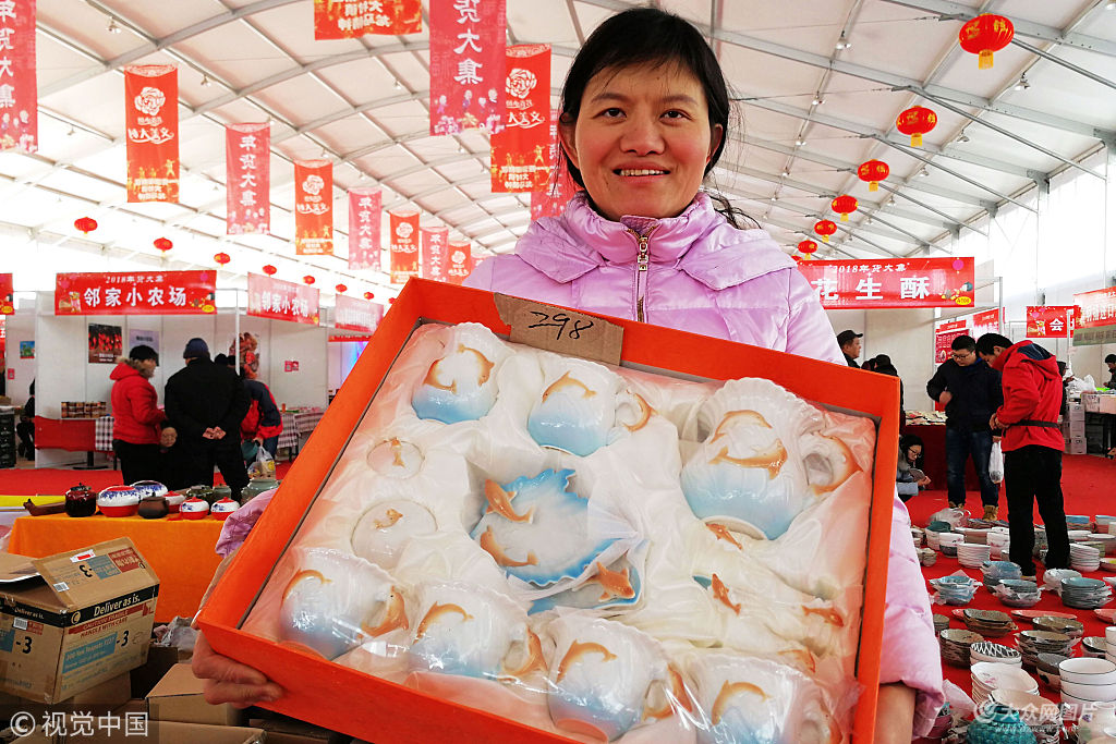 2018年2月3日,山東青島西海岸新區(qū)年貨大集上,一位攤販在展示自己出售的年貨商品。