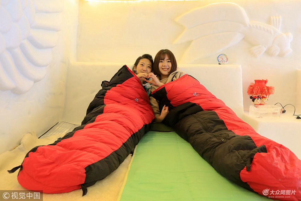 2018年2月4日,黑龍江漠河。北極村里,游客在冰雪旅館里體驗。據(jù)悉,這是我國最北端的冰雪旅館,房間價格是每天1280元。冰雪旅館的室內(nèi)設(shè)施主要由冰雪制作,前來體驗的多是廣東、福建、湖南等地的南方游客,游客的年齡多在20-30歲之間。