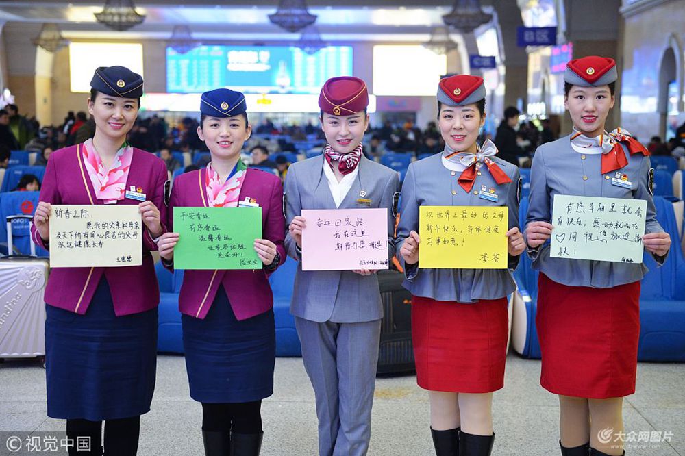 2017年2月4日,山東青島,在忙碌的春運(yùn)中,中國(guó)鐵路上除了高大上的硬件服務(wù)外,高顏值的美女列車(chē)長(zhǎng)們以姣好的形象,勤懇細(xì)致的服務(wù)和溫和的工作態(tài)度給人們留下了深刻的印象,為春運(yùn)旅行增加了一道靚麗的風(fēng)景線。為了保障春運(yùn)的平穩(wěn)運(yùn)輸,美女列車(chē)長(zhǎng)們往往不能陪伴父母歡度春節(jié),在新春佳節(jié)到來(lái)之際,她們紛紛寫(xiě)下寄語(yǔ),表達(dá)對(duì)親朋好友和旅客們的新春祝福。