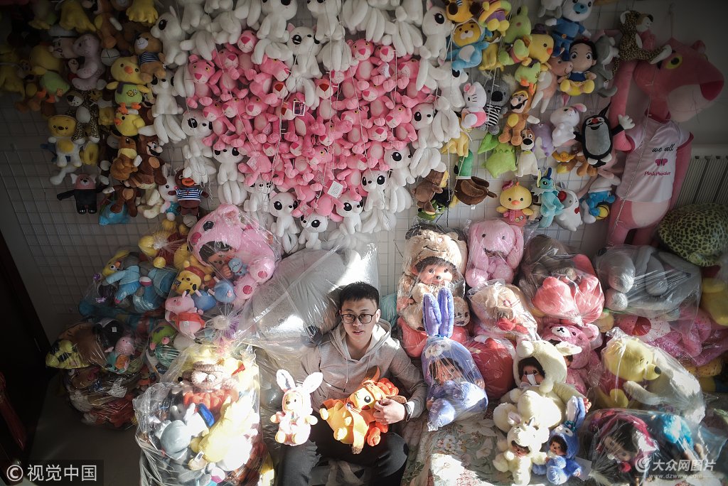 2018年2月4日,天津,即將到來的春節(jié),正好連著情人節(jié)。走進(jìn)曉強(qiáng)的家里,撲面而來的是滿墻的毛絨娃娃。為了應(yīng)景,他在墻上拼出了一個(gè)心形!芭阄疫^節(jié)的,也許就是它們了!彼f。