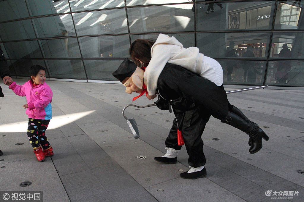 2018年2月10日,在山東濟南泉城廣場上,一位男子趙維勇扮演豬八戒在街頭逗樂路人,并且現(xiàn)場表演豬八戒背媳婦逗路人開心,還提倡大家過年禁止放鞭炮。
