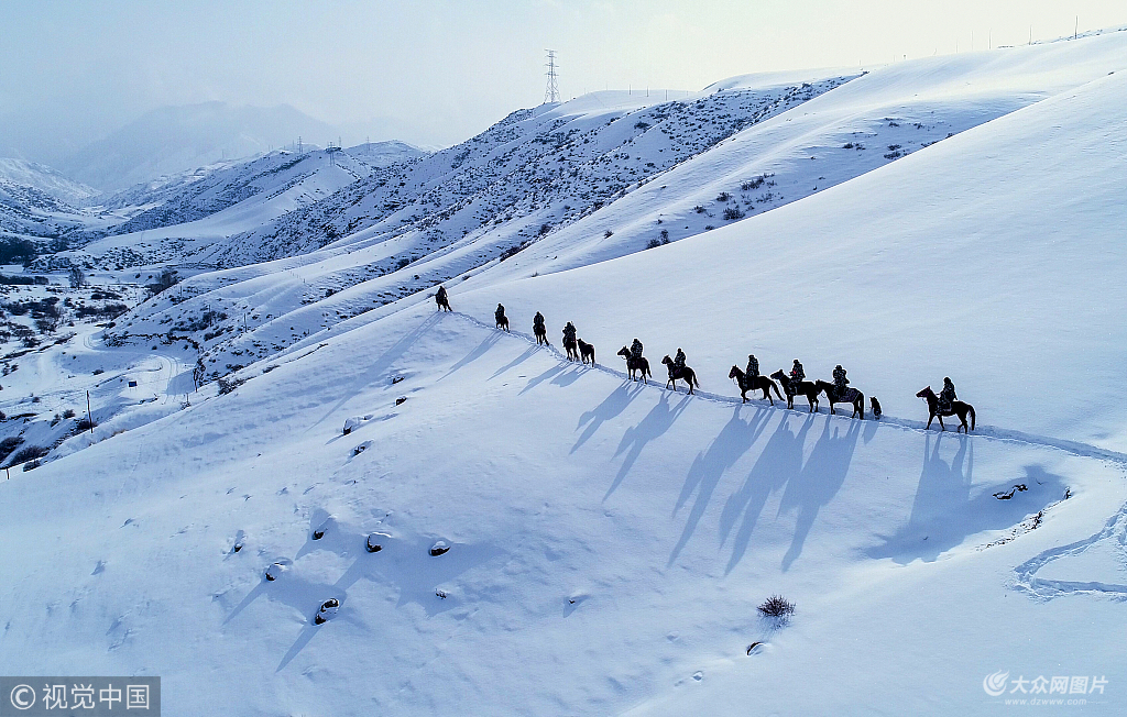2018年2月20日,在新疆維吾爾自治區(qū)察布查爾錫伯自治縣瓊博拉鄉(xiāng),由農(nóng)牧民組成的群眾護(hù)邊隊(duì)騎馬巡邏在邊境一線。