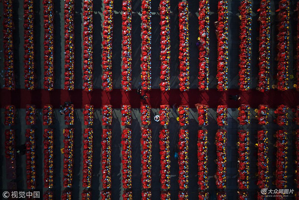 2018年2月23日,農歷正月初九,福建漳州天寶鎮(zhèn)珠里村玉尊宮舉行盛大的拜天公傳統(tǒng)習俗,廣場上整整齊齊擺滿了幾百多張桌子,桌子上擺滿各色供品,拜祭的信眾們以此祭拜天公,場面蔚為壯觀。相傳正月初九這一天是閩南地區(qū)“天公生”,也就是玉帝誕辰日,每到這一天的前夜,珠里村玉尊宮的家家戶戶都會在宮前的廣場上擺上供品,燃放煙花爆竹祭拜。
