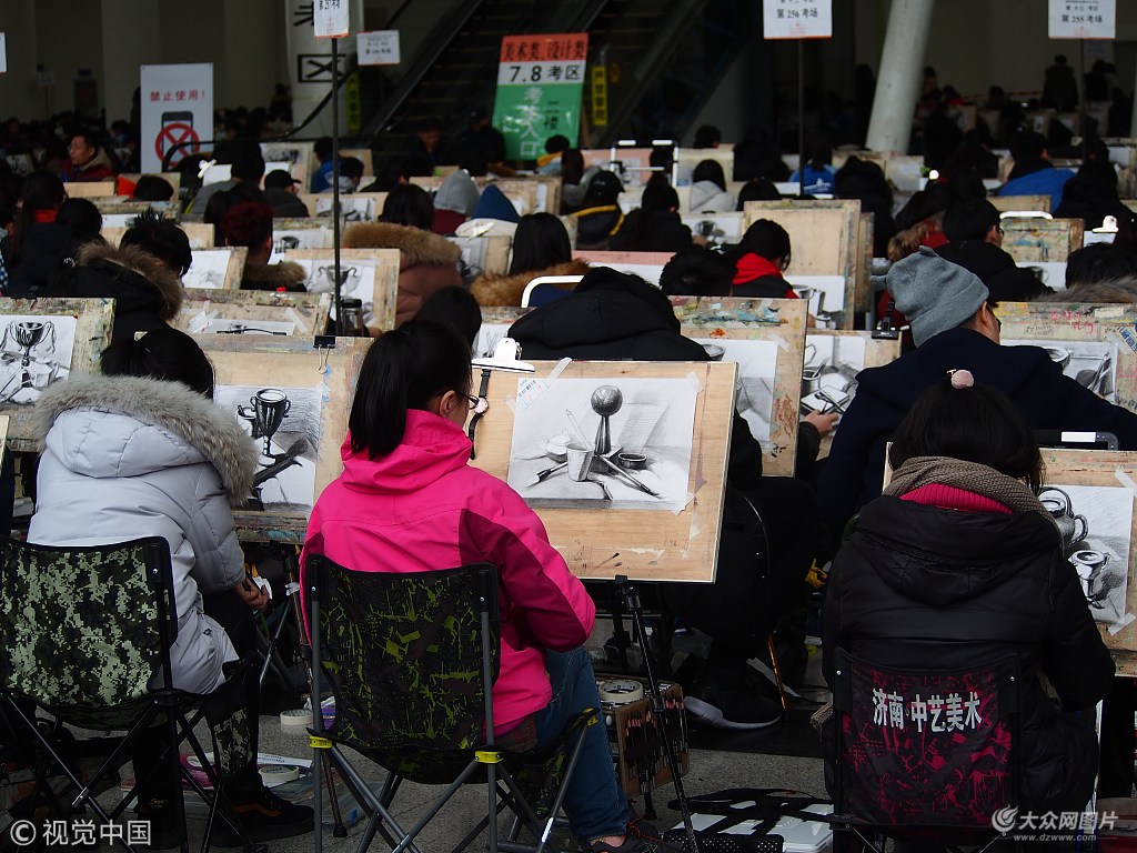2018年2月24日早晨,濟(jì)南舜耕國(guó)際會(huì)展中心,六千多名考生參加山東工藝美院舉行的美術(shù)類專業(yè)入學(xué)考試。一年一度的高考藝考大戰(zhàn)開場(chǎng),這些經(jīng)歷了數(shù)年苦練的學(xué)生們猶如踏上獨(dú)木橋,競(jìng)爭(zhēng)激烈。