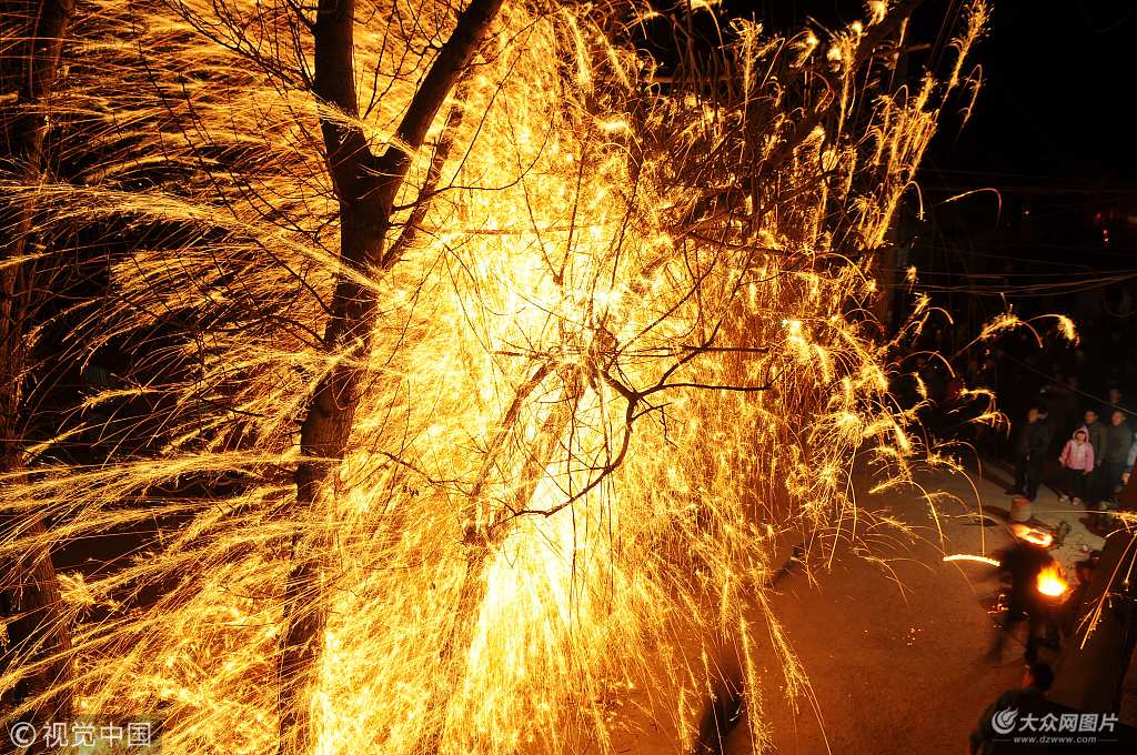 2018年2月24日,山東濟寧,在鄒城市大束鎮(zhèn)北葛村,打鐵花隆重上演。因部分村民節(jié)后進城工作,該村決定一年一度的打鐵花改在初九初十兩天天黑時舉行。72歲的孔令法和47歲的孔零雙是在2015年被鄒城市非遺保護中心發(fā)現并選為傳承人。自明代起此地涌現出冶鐵名匠,葛爐山的打鐵花表演從明代一直延續(xù)至今。