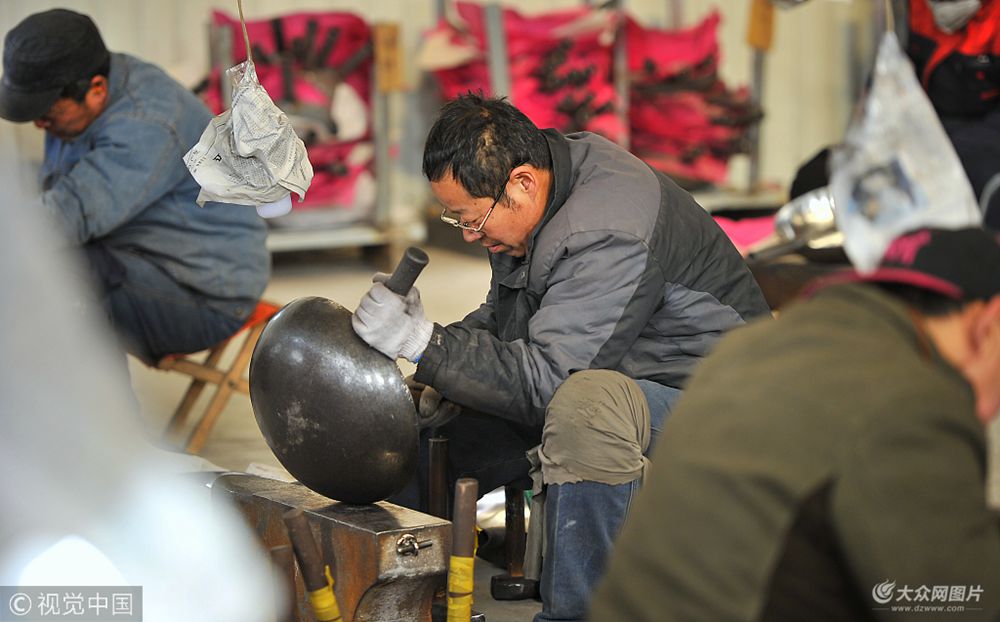 在章丘龍山街道的一處院落里,“叮叮當(dāng)當(dāng)”的敲打聲不絕于耳。這里是馮全永的手工鐵鍋廠,26個鐵匠師傅各自頭頂白熾燈,戴著口罩和耳塞,手里的鐵錘用力錘打在一口鐵鍋之上。已“沒落”幾十年的章丘鐵匠,在這處院落內(nèi)展現(xiàn)“重生”之勢。而當(dāng)《舌尖3》節(jié)目在2月19日晚播出后,章丘鐵鍋一夜爆紅。