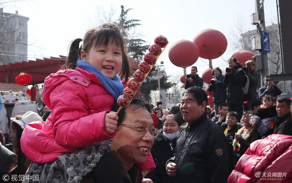 2018年3月2日,小朋友騎在家長身上逛青島糖球會。當(dāng)日是農(nóng)歷傳統(tǒng)的元宵佳節(jié),有500多年歷史的青島糖球會迎客流高峰,數(shù)十萬人前來參會,許多小朋友騎在家長身上逛廟會品美食看熱鬧,享受甜蜜幸福童年,成為一道美麗風(fēng)景。