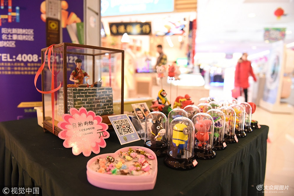2018年3月20日,在山東濟南一商場內(nèi),一個無人值守的面塑攤吸引了顧客關(guān)注,顧客挑選好自己喜歡的面塑作品后,只需掃碼支付就可以拿走面塑作品。