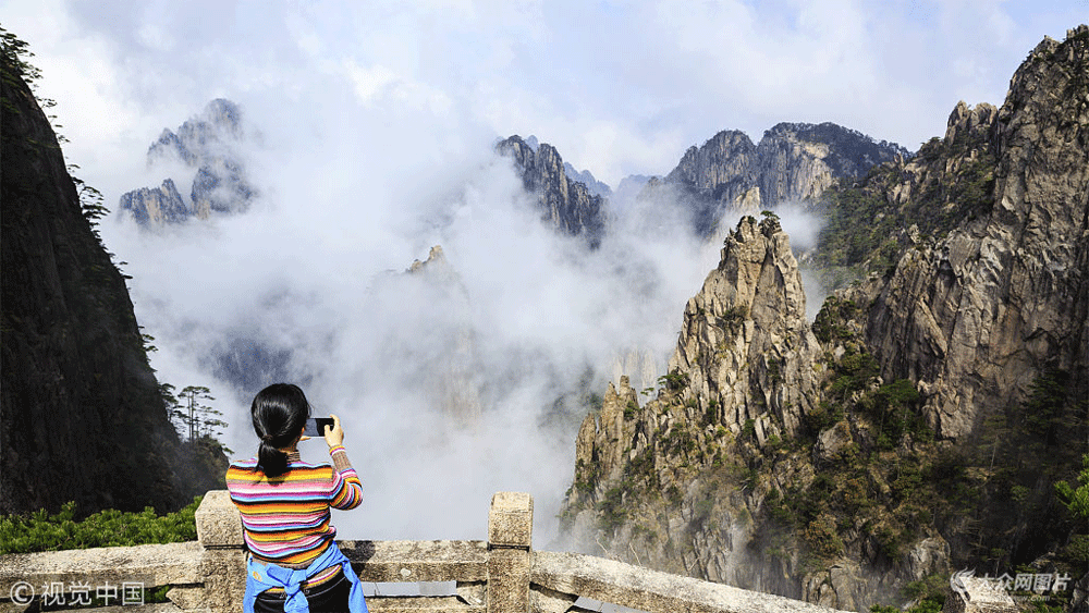 2018年3月26日,在黃山之巔拍攝的藍天青松和云?~緲圖片。中國最聞名的風景名勝區(qū)——安徽的黃山風景區(qū),不僅因它山峰起伏、層巒疊嶂、怪石嶙峋的奇石妙景,更因它似真似幻、渺渺茫茫、神秘深邃的意境之美。