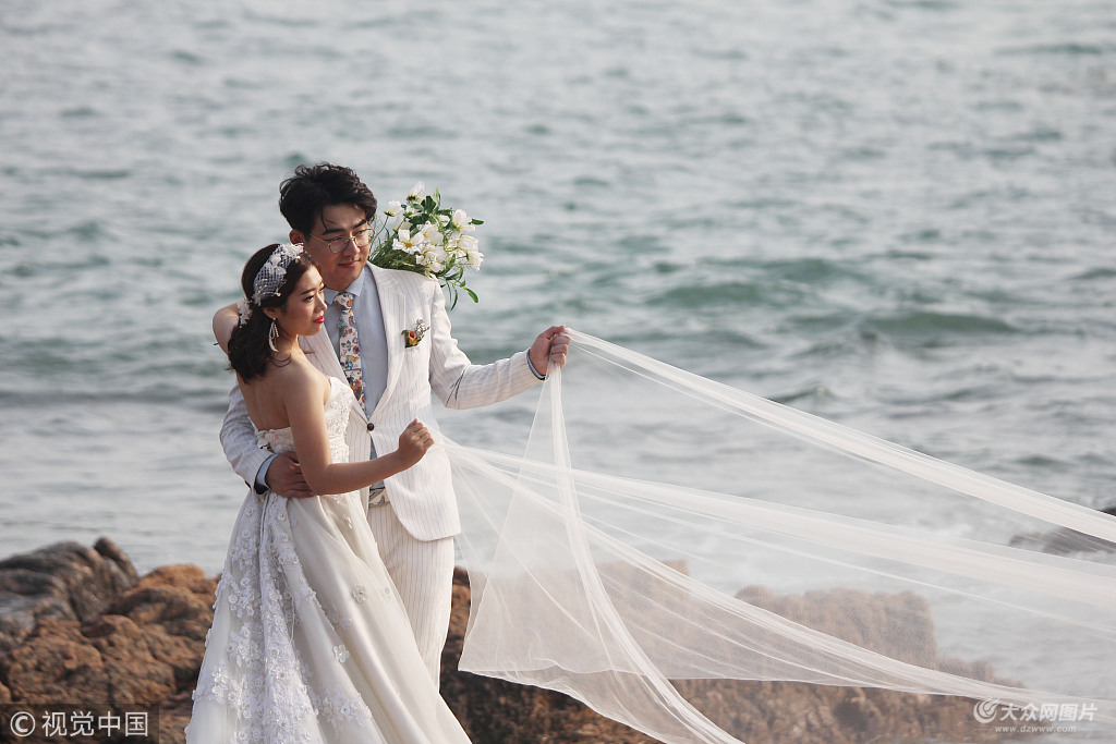 青島:新人扎堆拍婚紗照 海邊定格幸福時(shí)光