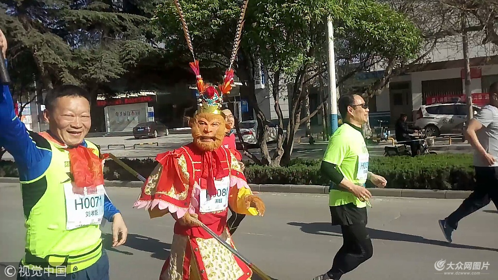2018年4月7日,山東菏澤舉辦半程馬拉松比賽,一位選手身披孫悟空造型服裝,手持金箍棒參賽,頗有創(chuàng)意。