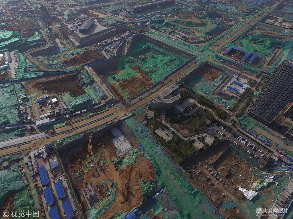2018年4月9日,濟(jì)南,從航拍畫面看到,被譽(yù)為CBD之“山”的主塔樓綠地國(guó)際金融中心,超高層基坑已挖好,基坑深度超過20米,截至2017年底核心筒達(dá)到正負(fù)零。