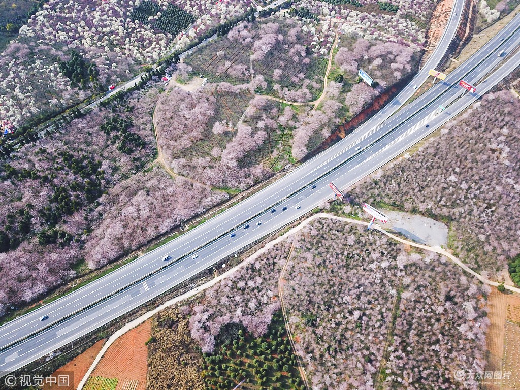2018年3月10日,拍攝的貴州省貴陽境內(nèi)滬昆高速紅楓湖畔的左二村路段,這段公里被櫻花園裝點(diǎn),空中俯瞰十分壯觀,許多司機(jī)說這是貴州最美高速。