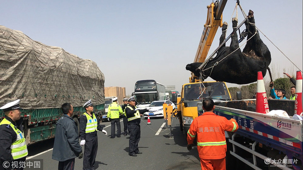 2018年4月15日,青島,“一頭牛在青新高速下行51KM處,見人就撞!車都不敢走了,你們快來處理一下吧!”15日,青新高速青島段來了一位不速之客,一頭成年澳洲公牛從運輸車掉落,一度阻礙交通。青島高速交警趕到后,與貨主一起努力,最后調(diào)來了吊車才成功將其制服。因為缺乏專業(yè)器具,一名警察還在制服過程中扭傷了腰。