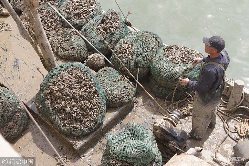 2018年4月15日,山東日照,位于臧家荒附近的黃海中心漁港,一片熱鬧景象—漁民們忙著從漁船上吊運(yùn)牡蠣,停靠在碼頭上的貨車,牡蠣堆成了小山。一些周末游玩的游客也來到碼頭上買一點(diǎn)新鮮的牡蠣。今年的牡蠣又肥又大,而且價(jià)格也不貴,10元錢就能買4斤,這讓吃貨們歡呼雀躍。