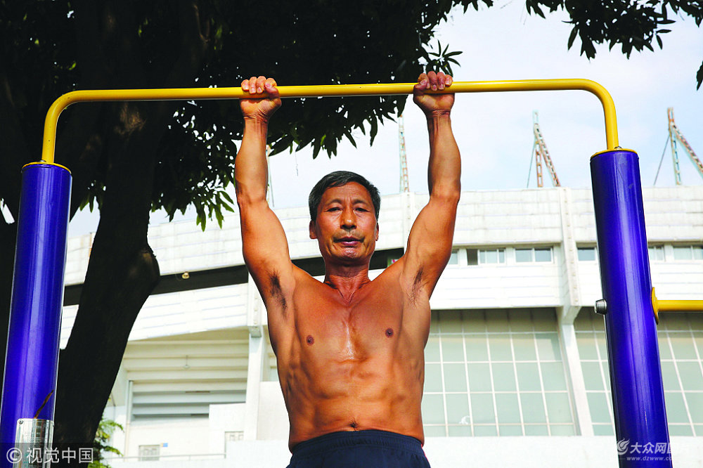 臧旭升,66歲,退休推拿師。11歲開始練業(yè)余體操,至今堅持55年。年輕時可一口氣在單杠上做90個360°大回環(huán),退休后仍堅持至今。雖已年過花甲,卻仍能做出50個大回環(huán)。近幾年,中山有部分市民開始跟隨他鍛煉,大家習慣稱呼他“臧老師”或者“男神”。夢想把數(shù)十年鍛煉心得形成文字,傳授給更多人。