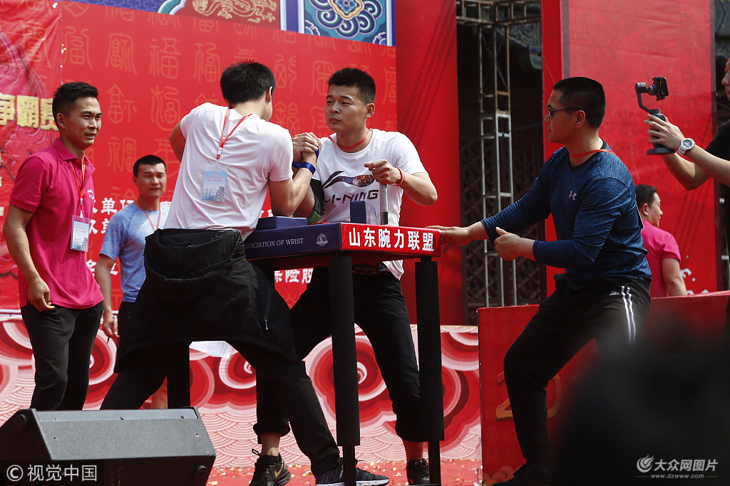 作為2018泰山東岳廟會(huì)的一部分,首屆中國(guó)泰山腕力王爭(zhēng)霸賽在泰山岱廟舉行,比賽吸引來(lái)近百位專業(yè)斗腕選手在腕力桌上奮力角逐,現(xiàn)場(chǎng)觀眾被緊張的賽事深深吸引。談起掰手腕,多數(shù)人的第一反應(yīng)是“掰腕子”的民間運(yùn)動(dòng),拼的是爆發(fā)力和手臂力量,而作為一項(xiàng)專業(yè)運(yùn)動(dòng)的腕力運(yùn)動(dòng)絕不是簡(jiǎn)單的力量對(duì)決,腕力比的是心智,如何揣測(cè)對(duì)手的目的、破解對(duì)手的招數(shù),才是取勝的關(guān)鍵。除此之外,腕力拼的不僅是手部力量,胸部、腹部、背部、腿部的肌肉也需要發(fā)力,正所謂“人臂合一”。腕力比賽與普通的“掰腕子”不同,腕力比賽中,雙方選手采用站立姿勢(shì),分別站在腕力臺(tái)兩側(cè),臺(tái)面上通常設(shè)有代表雙方不同顏色的墊板,比賽時(shí)選手的手肘不得離開(kāi)墊板,此外還有發(fā)力時(shí)可以協(xié)助握持的金屬抓手,以及雙方的決勝墊,比賽以將對(duì)手拳頭頂部掰至碰觸到?jīng)Q勝墊為勝利。