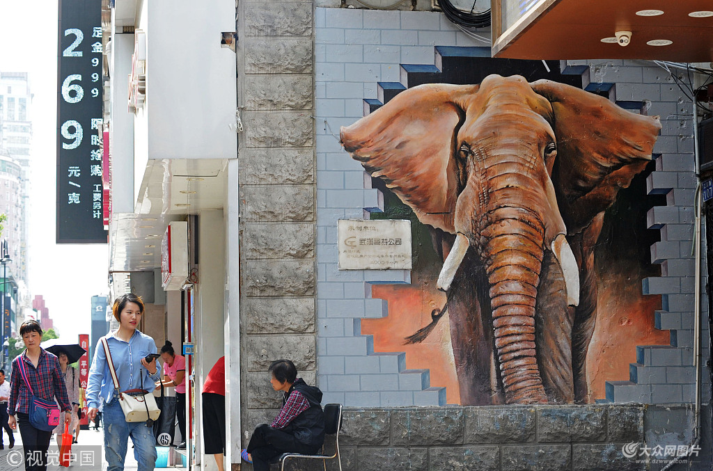 2018年5月4日,武漢,一幅幅3D彩繪墻亮相漢口中山大道,給街市帶來新景觀,吸引不少市民拍照。