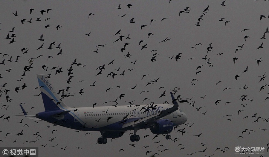 當(dāng)?shù)貢r間2018年6月27日,印度布巴內(nèi)斯瓦爾,一架準(zhǔn)備降落的飛機(jī)撞上起飛的鴿群,被層層包圍。