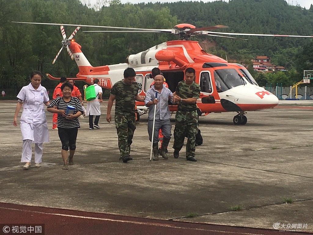 2018年7月12日,四川遂寧,救援直升機(jī)趕到現(xiàn)場,在“孤島”與安置點(diǎn)之間開通臨時(shí)“航線”,將島上的病人、老人、小孩、婦女轉(zhuǎn)移到安全地帶。