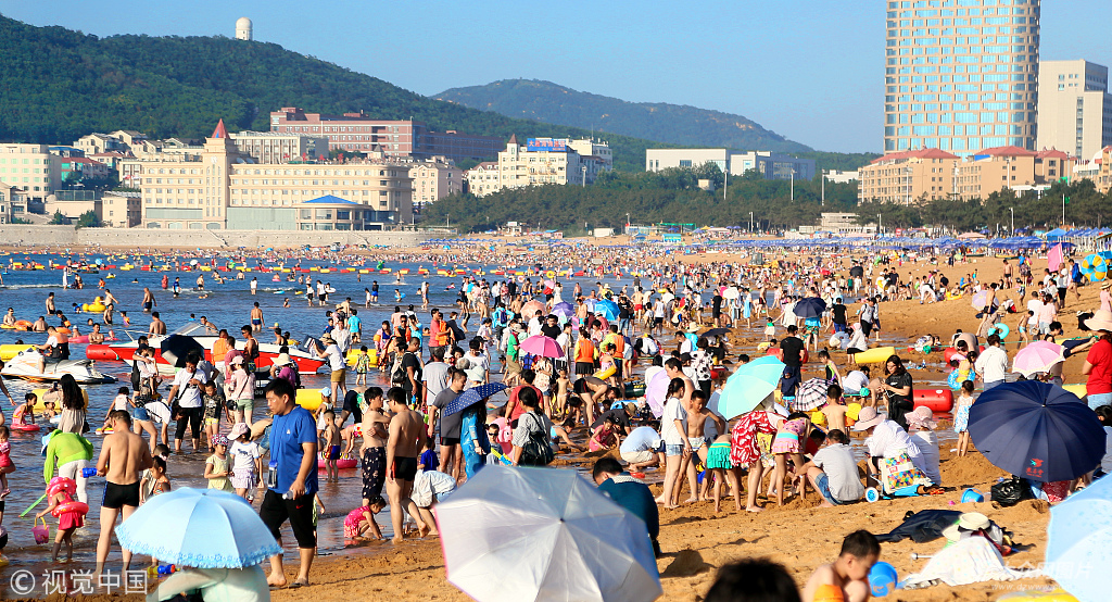 2018年7月14日,山東威海國際海水浴場(chǎng),游客人山人海 如下餃子般擠爆海水浴場(chǎng)。旅游旺季和連日來的高溫催熱威海國際海水浴場(chǎng)的旅游經(jīng)濟(jì),萬余人擠爆國際海水浴場(chǎng)暢享清涼。