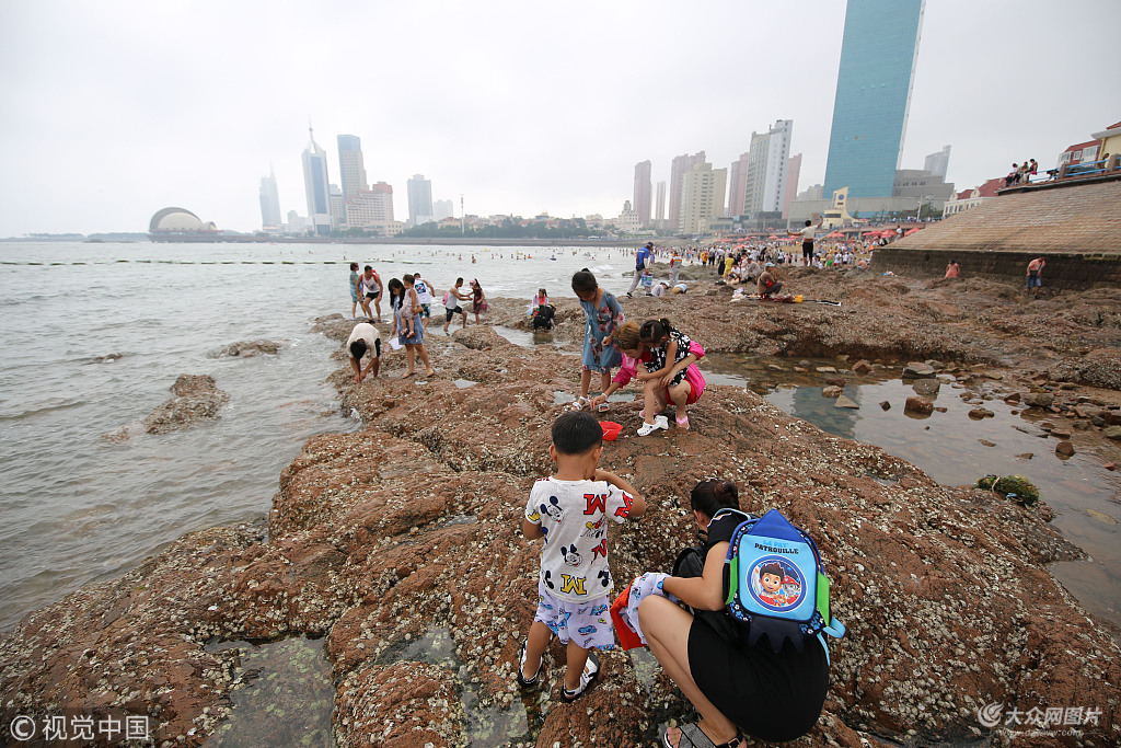 2018年7月20日,游人在青島棧橋景區(qū)趕海拾趣。夏日炎炎,棧橋避暑旅游火爆,退潮時(shí)灘涂礁石區(qū)大批游人捉螃蟹挖蛤蜊摸魚兒,享受大海樂(lè)趣清涼度夏。