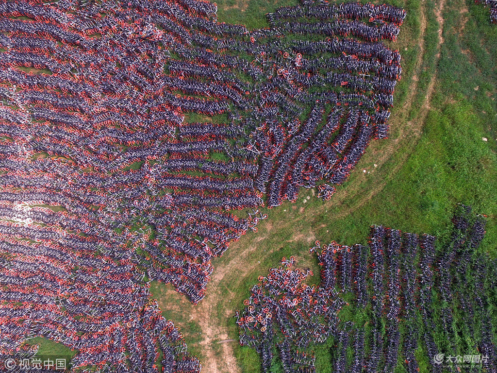 2018年8月1日,武漢市蔡甸區(qū)一空地上密集堆放了近兩萬(wàn)輛共享單車,從空中看像纏在一起的頭發(fā)絲,又像是爬滿樹葉的蟲子,場(chǎng)景令人震撼。
