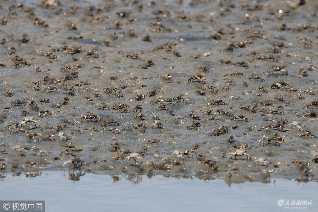 2018年8月2日,數(shù)以億計小螃蟹在山東省青島膠州灣李村河口灘涂上覓食。夏日炎炎螃蟹歡,每天退潮后膠州灣潮間帶灘涂裸露,密密麻麻的小螃蟹集體出洞覓食,揮舞兩只蟹鉗吞食泥沙和空氣,萌萌噠可愛之極。這些小螃蟹小如米粒大不過硬幣,以日本大眼蟹居多,還有天津厚蟹、豆形拳蟹、招潮蟹等。數(shù)量龐大的小螃蟹也吸引大批水鳥前來啄食,大快朵頤。