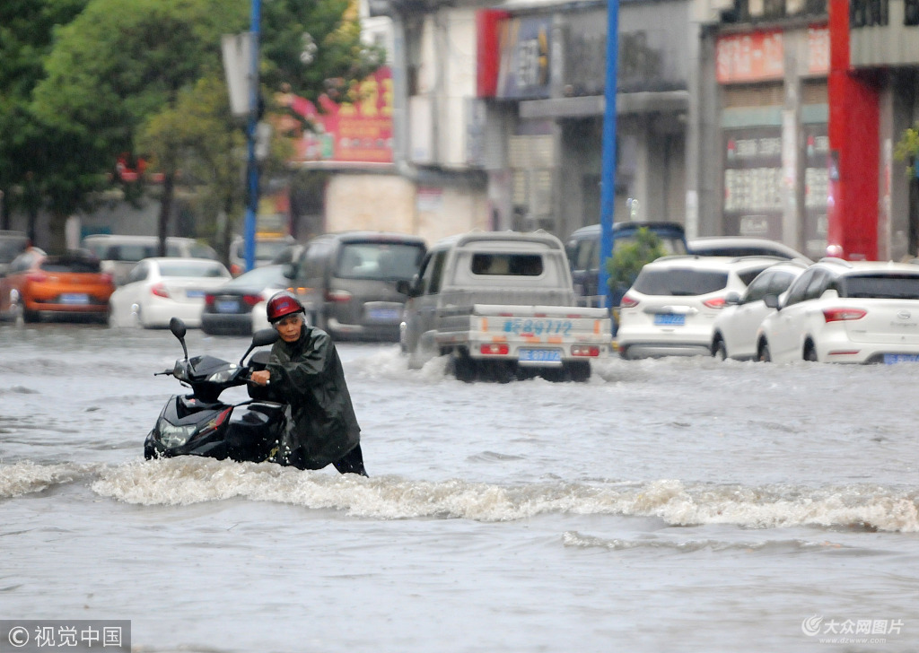 2018年8月4日,江西九江,市民在街頭頂著暴雨出行。當天傍晚,受臺風(fēng)“云雀”外圍影響,江西九江出現(xiàn)強降雨,市區(qū)部分路段積水嚴重,給市民出行帶來不便。圖片作者:胡國林/視覺中國