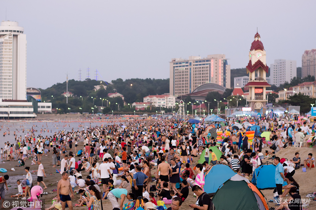 2018年8月4日,山東煙臺,傍晚時(shí)分,不少市民避開白天的烈日來到海水浴場下海乘涼。圖片作者:劉臣臣/視覺中國
