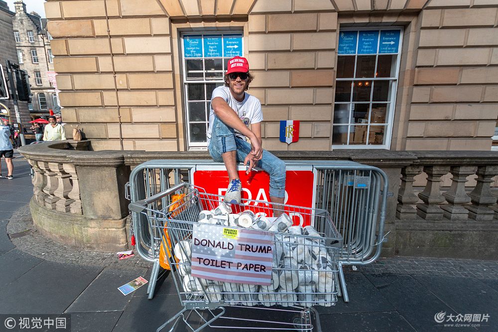 2018年8月8日訊(具體拍攝時間不詳),英國愛丁堡,29歲的Tim Baker在愛丁堡邊緣藝術節(jié)上售賣印有美國總統(tǒng)特朗普頭像的衛(wèi)生紙。按照一卷3磅兩卷5磅的價格,僅僅4天的時間他就賣出了一千卷,照這樣的速度,一周內便能收入四千多英鎊(約合人民幣4萬元左右)。