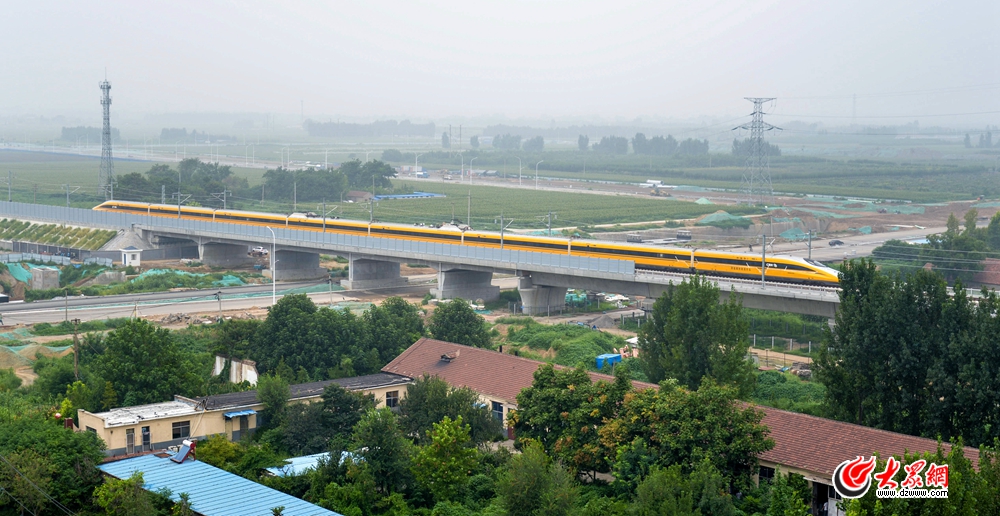 2018年8月9日上午10時(shí)許,一列車身噴涂黃色標(biāo)識(shí)的動(dòng)檢列車駛過(guò)濟(jì)青高鐵淄博豬龍河橋、西五路跨線橋。列車飛馳而過(guò),宛如一條黃龍,行駛在綠毯上,薄霧中掠出印記,駛向濟(jì)南方向。