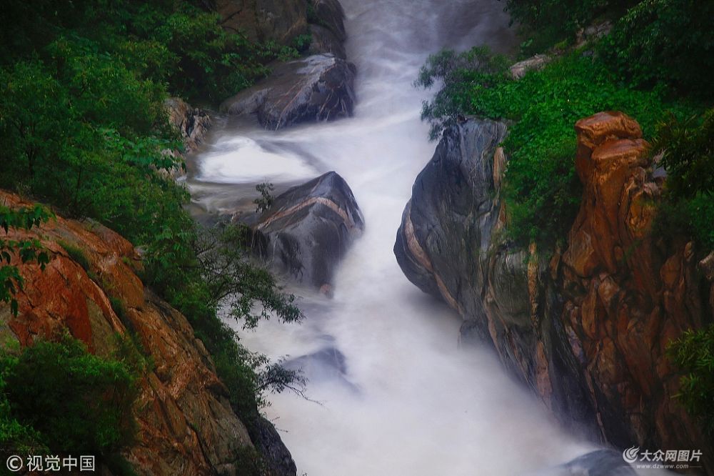 2018年8月19日,山東泰安,連日來(lái)的降雨,使得泰山龍?zhí)讹w瀑、高山流水等泰山水景再現(xiàn),雨中的泰山大石峽水流湍急,龍?zhí)讹w瀑直流而下,聲勢(shì)浩大,氣勢(shì)恢宏,吸引來(lái)眾多游客和市民冒雨前來(lái)賞景。
