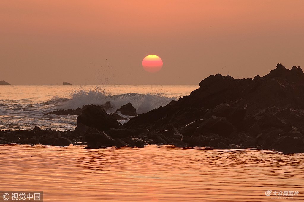 2018年8月21日,日出時(shí)的青島西海岸石雀灘海濱美輪美奐。當(dāng)日早晨,青島秋高氣爽,西海岸石雀灘海濱空氣清新,視野通透。朝陽從海平面上冉冉升起,一派祥和、靜美景象。