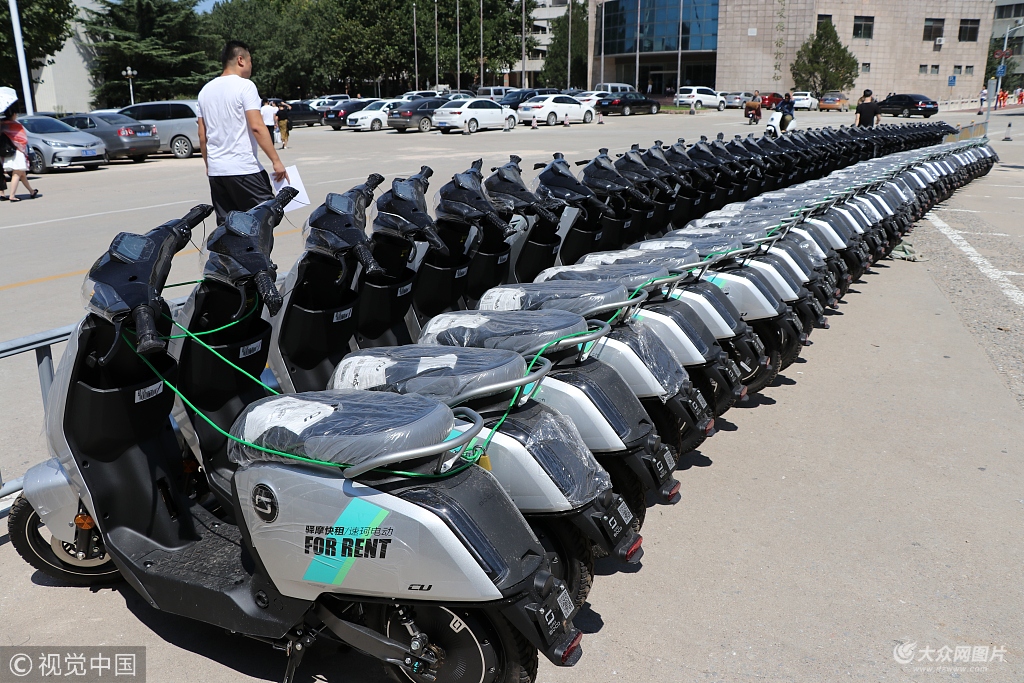 2018年8月25日,濟南,山東財經(jīng)大學舜耕校區(qū)出現(xiàn)了一排排嶄新的共享電動車。據(jù)了解,這些電動車將在大學開學后啟用,山東財經(jīng)大學舜耕校區(qū)和燕山校區(qū)計劃投放200輛共享電動車,騎行費用擬定為15分鐘1元錢。