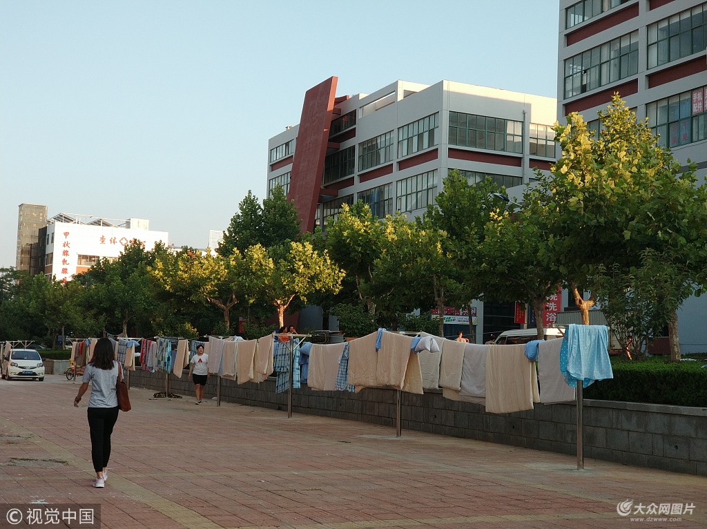 2018年8月25日,山東煙臺(tái)某學(xué)院開(kāi)學(xué),不少學(xué)生趁著天氣晴朗,將自己被子晾曬,不少住陰面的學(xué)生拿到樓下涼曬,幾乎能放被子的地方都被學(xué)生搭曬。