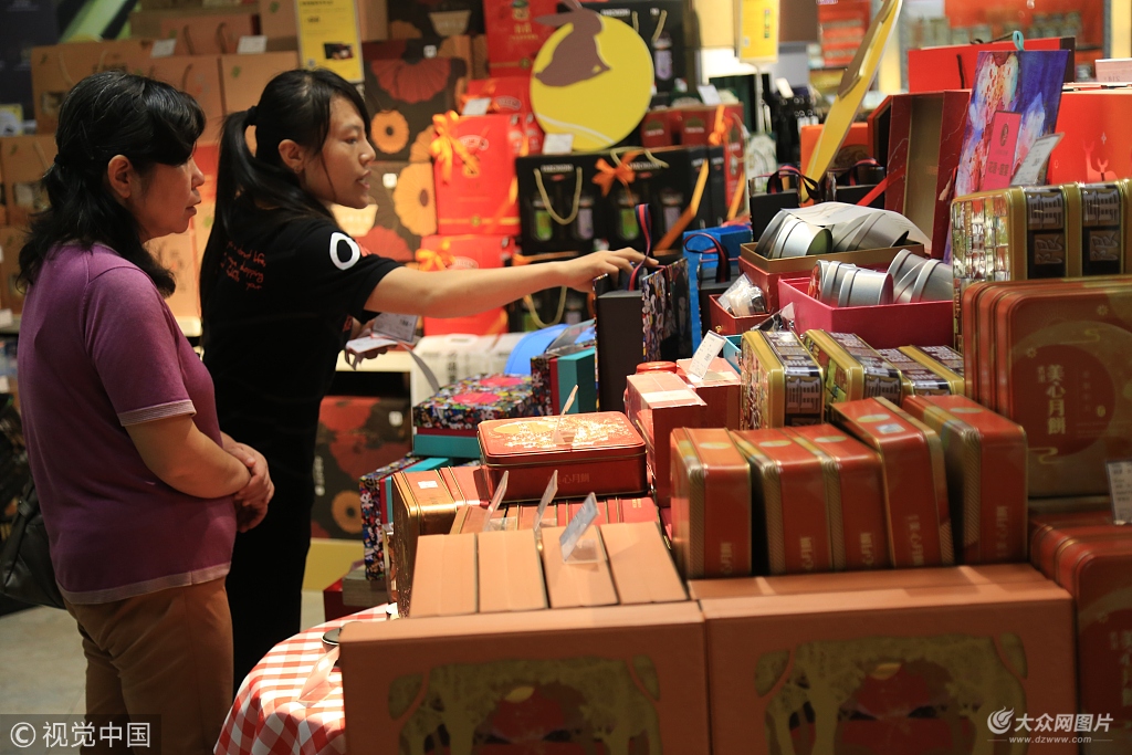2018年8月29日,濟(jì)南,泉城路某超市結(jié)賬區(qū)域顯眼位置擺放各種禮品盒月餅搶占中秋商機(jī)。