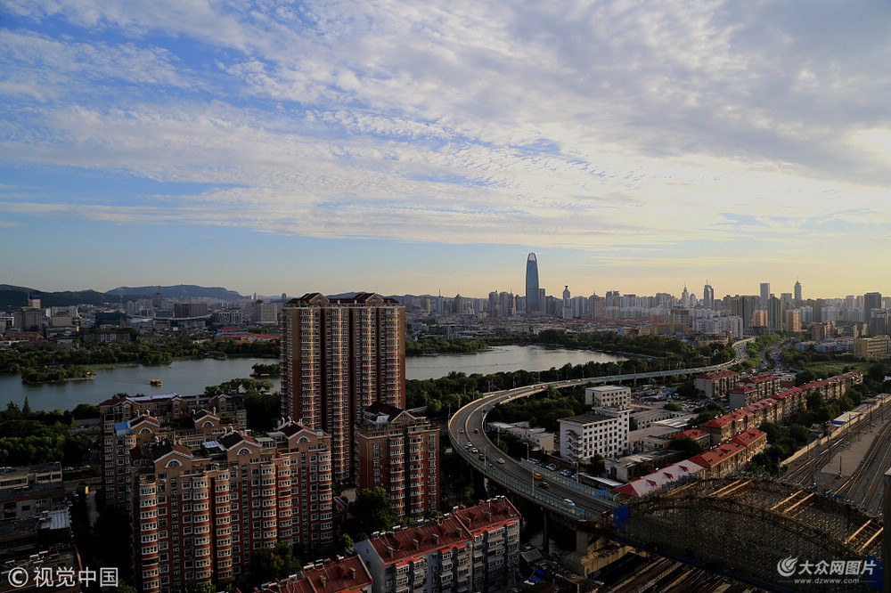 2018年9月4日傍晚,山東濟南,夕陽連天際,邊色滿秋空。夕陽斜照,蔚藍的天空浮動云朵,他們在夕陽映照下呈現(xiàn)出火焰般的胭紅色,與大明湖相互映襯如一幅畫卷呈現(xiàn)在濟南市民眼前。