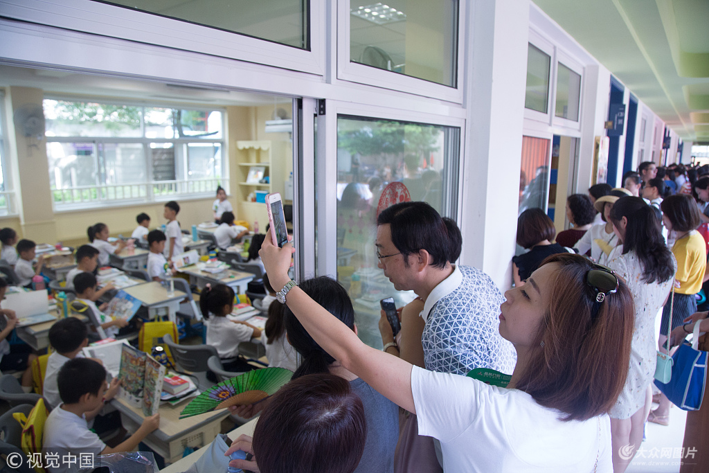 2018年9月2日,杭州長江實驗小學開學,一年級生迎來小學第一堂課。教室內(nèi)小朋友認真聽課,教室外窗口門框邊倚靠著很多圍觀家長。爺爺奶奶爸爸媽媽齊刷刷地簇擁在教室外觀望,時而拿出手機記錄孩子們的人生第一課。