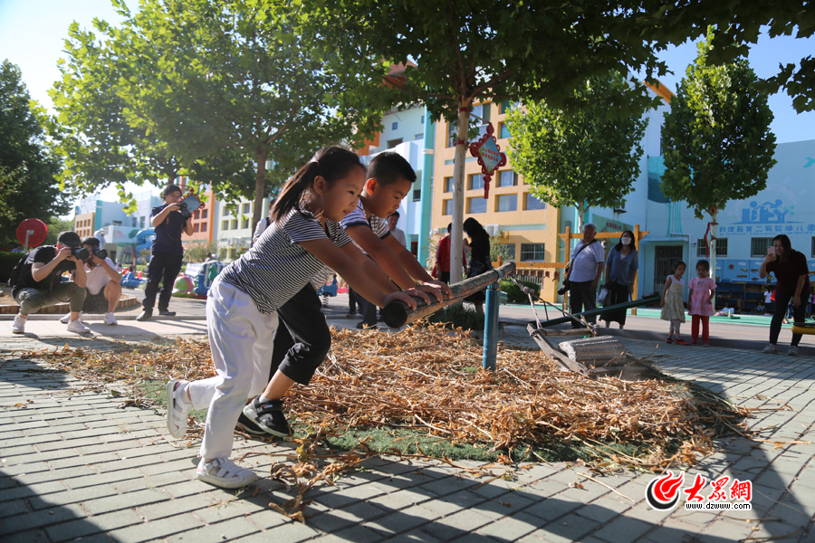 大眾網東營9月9日訊 9月7日下午,山東藝術學院黃河灘遷建創(chuàng)作組走進利津二幼。圖為利津縣第二實驗幼兒園里,具有黃河灘地域文化特色的打真游戲