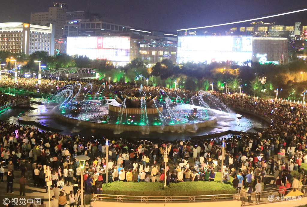 2018年10月3日晚上,濟(jì)南,泉城廣場上人山人海,眾多游客聚集在此用手機(jī)紀(jì)錄音樂噴泉美景。