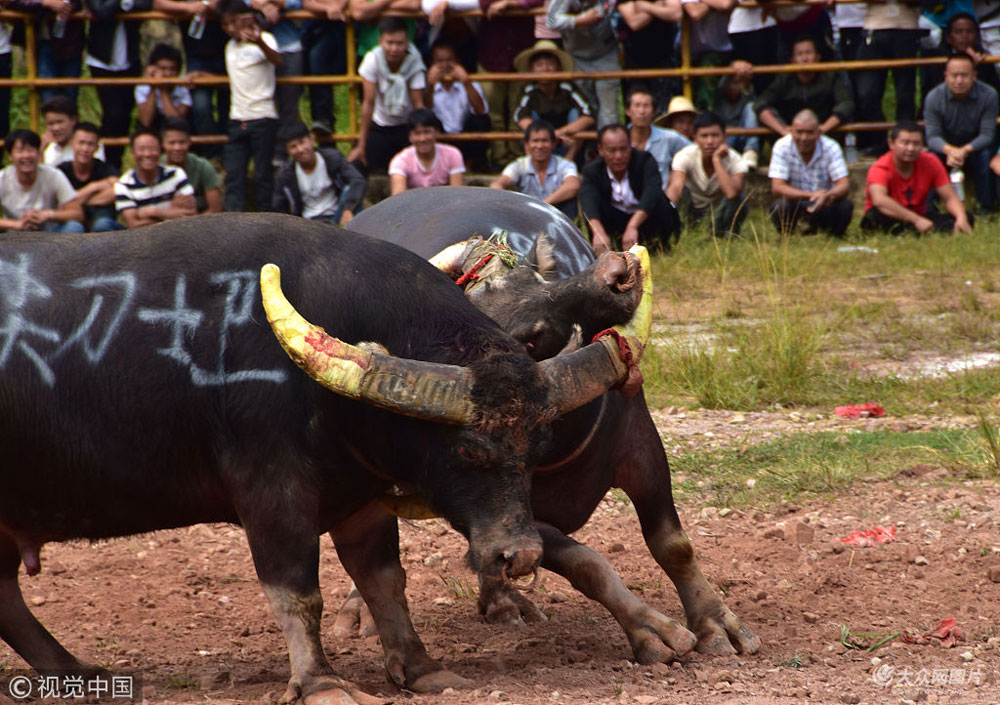 2018年10月4日,貴州省黔東南苗族侗族自治州從江縣下江鎮(zhèn)歸江斗牛塘舉行斗牛比賽活動,來自從江、榕江及雷山等地的26對水牯牛在這里比拼,吸引了眾多游客及周邊村民前來觀看,共度假日。
