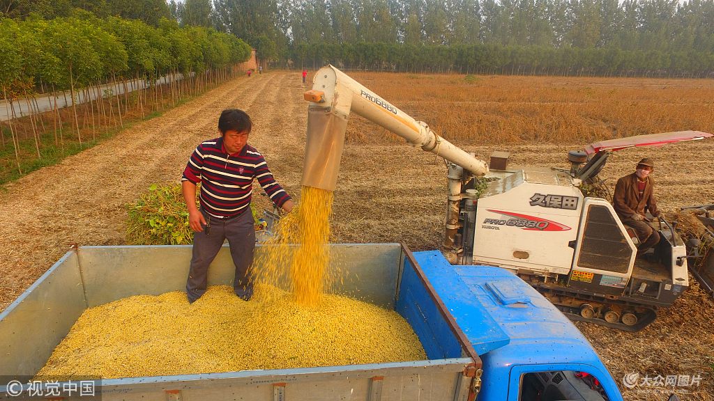 2018年10月8日,在山東省聊城市茌平縣賈寨鎮(zhèn)后寨村,鑫浩園家庭農(nóng)場(chǎng)主賈國(guó)才在收割大豆。(航拍圖片)