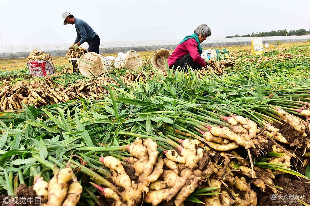 2018年10月21日,山東省濰坊青州市東夏鎮(zhèn)西夏村農(nóng)民在裝卸大姜。