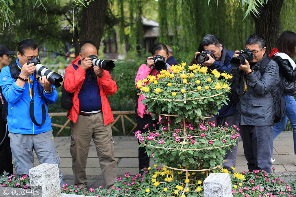 2018年10月21日,濟(jì)南,第39屆菊花展將拉開帷幕,園林藝術(shù)師傅正在緊張布景。